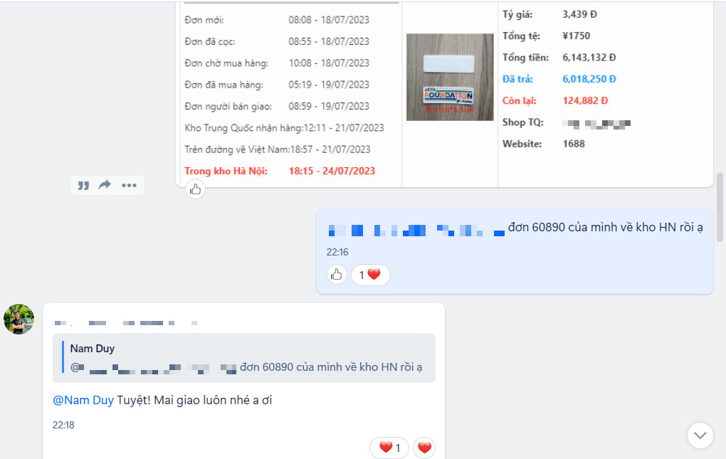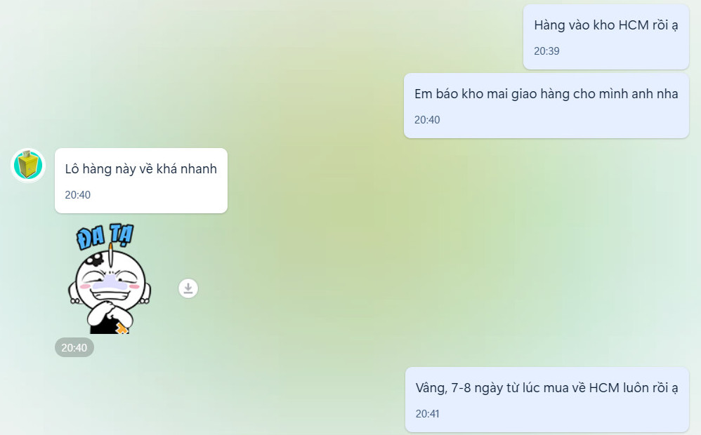 Sau khi hàng về Việt Nam, bạn có thể tiến hành thanh toán phần phí còn lại, và có thể yêu cầu giao hàng tận nhà hoặc bạn đến kho chúng tôi lấy hàng.